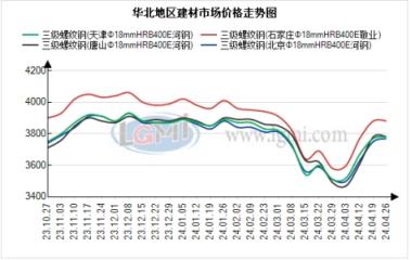 云商平臺監(jiān)測數據顯示,截至4月26日午間,天津市場Φ18mm三級抗震螺紋鋼價格為3780元,比上周同期價格漲10元;北京市場Φ18mm三級抗震螺紋鋼價格為3770元,比上周同期價格漲20元;唐山市場Φ18mm三級抗震螺紋鋼價格為3780元,比上周同期價跌10元;石家莊市場Φ18mm三級抗震螺紋鋼價格為3880元,與上周同期價格持平。