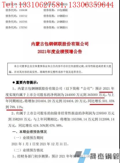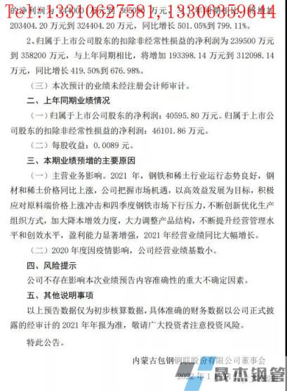 1月11日晚,鋼鐵板塊的牛股包鋼股份公布業(yè)績(jī)預(yù)告,預(yù)計(jì)2021年度實(shí)現(xiàn)歸屬于上市公司股東的凈利潤(rùn)為24.4億元到36.5億元,與上年同期相比,將增加20.34億元到32.44億元,同比增長(zhǎng)501.05%到799.11%;歸屬于上市公司股東的扣除非經(jīng)常性損益的凈利潤(rùn)為23.95億元到35.82億元,與上年同期相比,將增加19.34億元到31.21億元,同比增長(zhǎng)419.50%到676.98%。