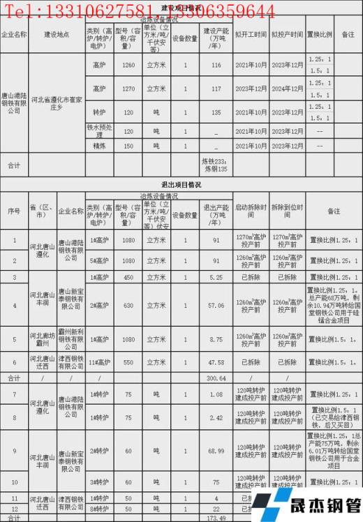 唐山港陸鋼鐵有限公司退出1080m3高爐2座、退出產(chǎn)能182萬(wàn)噸;75t轉(zhuǎn)爐2座,退出產(chǎn)能3.5萬(wàn)噸/年;唐山新寶泰鋼鐵有限公司450m3高爐1座,退出產(chǎn)能5.25萬(wàn)噸/年;630m3高爐1座,退出產(chǎn)能57.06萬(wàn)噸/年;60t轉(zhuǎn)爐2座,退出產(chǎn)能143.99萬(wàn)噸/年;霸州新利鋼鐵有限公司1080m3高爐1座,退出產(chǎn)能8.75萬(wàn)噸/年;津西鋼鐵有限公司退出550m3高爐1座,退出產(chǎn)能47.58萬(wàn)噸/年;50t轉(zhuǎn)爐2座,退出產(chǎn)能26萬(wàn)噸/年。共計(jì)退出煉鐵產(chǎn)能300.64萬(wàn)噸,煉鋼產(chǎn)能173.49萬(wàn)噸,所有項(xiàng)目將于新建項(xiàng)目建成投產(chǎn)前拆除。