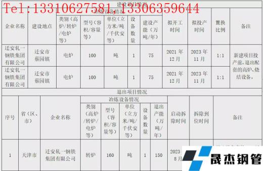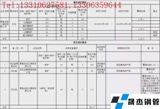秦皇島佰工鋼鐵有限公司退出60t轉(zhuǎn)爐2座,產(chǎn)能150萬(wàn)噸/年;河北吉泰特鋼有限公司退出50t電爐1座,產(chǎn)能30萬(wàn)噸/年;秦皇島宏興鋼鐵有限公司退出60t轉(zhuǎn)爐1座,產(chǎn)能1.5萬(wàn)噸/年。共計(jì)退出煉鋼產(chǎn)能181.5萬(wàn)噸,所有項(xiàng)目將于新建項(xiàng)目建成投產(chǎn)前拆除。