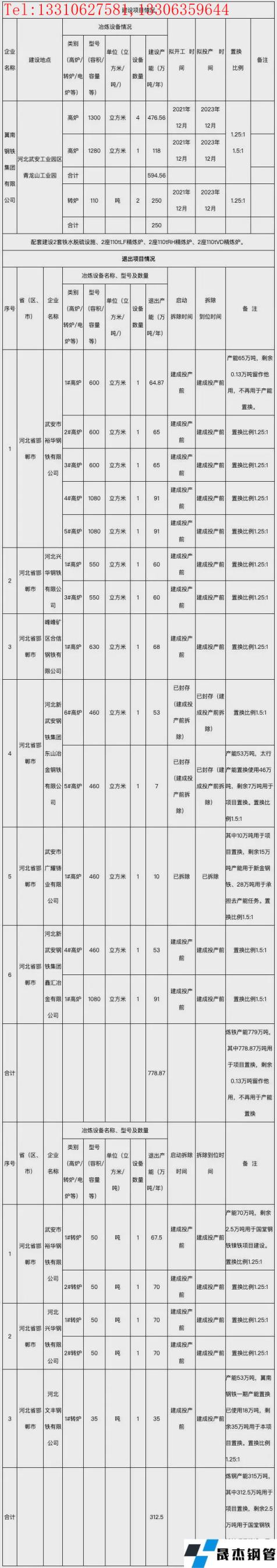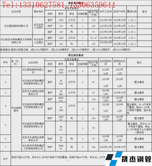 河北普陽(yáng)鋼鐵有限公司退出高爐1050m3高爐2座,退出產(chǎn)能178萬(wàn)噸/年。河北新武安鋼鐵集團(tuán)烘熔鋼鐵有限公司退出620m3高爐1座,退出產(chǎn)能67萬(wàn)噸/年;退出60t轉(zhuǎn)爐3座,產(chǎn)能225萬(wàn)噸/年。武安市永誠(chéng)鑄業(yè)有限責(zé)任公司退出460m3高爐1座,退出產(chǎn)能53萬(wàn)噸/年;退出55t轉(zhuǎn)爐1座,產(chǎn)能72萬(wàn)噸/年。河北新武安鋼鐵集團(tuán)文安鋼鐵有限公司退出510m3高爐2座,退出產(chǎn)能114萬(wàn)噸/年;退出1080m3高爐1座,退出產(chǎn)能91萬(wàn)噸/年;退出50t轉(zhuǎn)爐2座,產(chǎn)能140萬(wàn)噸/每年。共計(jì)退出煉鐵產(chǎn)能503萬(wàn)噸,其中502.4萬(wàn)噸產(chǎn)能用于項(xiàng)目置換;退出煉鋼產(chǎn)能437萬(wàn)噸,其中431.25萬(wàn)噸產(chǎn)能用于項(xiàng)目置換,所有項(xiàng)目將于2023年10月前拆除。
