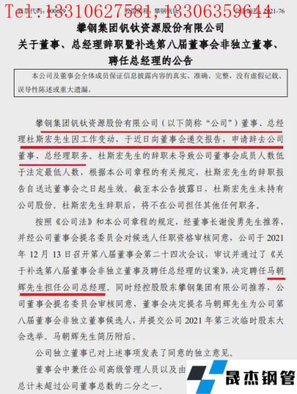 12月13日,攀鋼釩鈦董事會收到公司董事、總經理杜斯宏因工作變動,于近日向董事會遞交報告,申請辭去公司董事、總經理職務。杜斯宏的辭職未導致公司董事會成員人數低于法定最低人數,根據本公司章程的有關規定,杜斯宏的辭職報告自送達董事會之日起生效。截至本公告披露日,杜斯宏未持有公司股份。杜斯宏辭職后,將不在公司擔任其他任何職務。