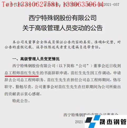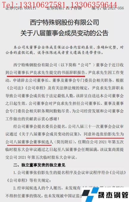 2021年12月10日,西寧特鋼發布公告,公司人事變動:董事長尹良求、總工苗紅生辭職!張伯影擬任董事!