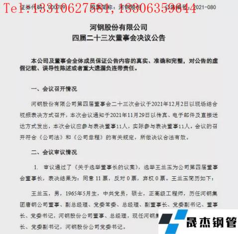 12月3日河鋼股份有限公司(以下簡稱河鋼股份)發布了第四屆二十三次董事會決議公告,據該公告顯示,河鋼股份第四屆董事會二十三次會議于2021年12月2日以現場結合視頻表決方式召開,會議審議并通過了《關于選舉董事長的議案》,選舉王蘭玉為公司第四屆董事會董事長。