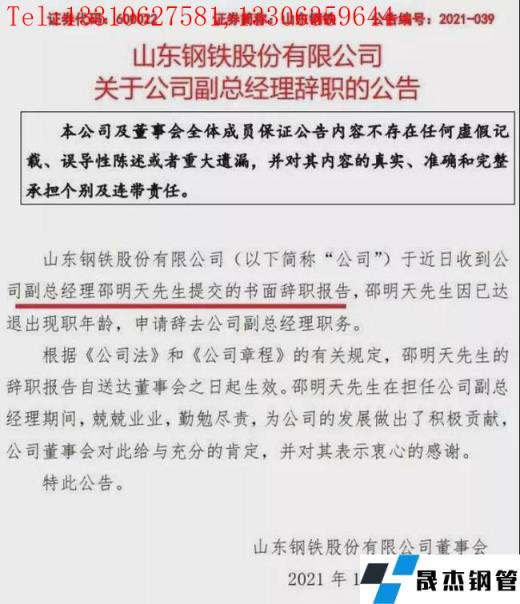 12月1日,山東鋼鐵發布公告稱,于近日收到公司副總經理邵明天先生提交的書面辭職報告。邵明天先生因已達退出現職年齡,申請辭去公司副總經理職務。