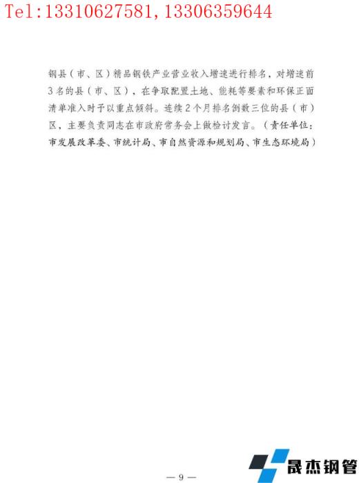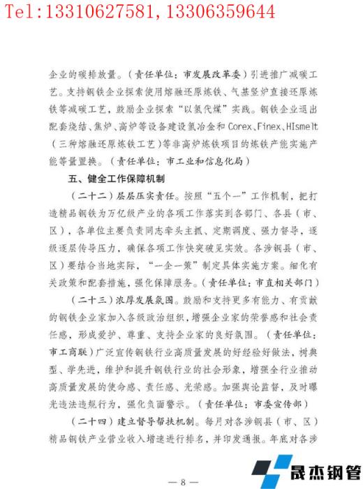 按照"五個一"工作機制,把打造精品鋼鐵為萬億級產業的各項工作落實到各部門、各縣(市、區),結合當地實際,"一企一策"制定具體實施方案。鼓勵和支持更多有能力、有貢獻的鋼鐵企業家加入各級政治組織,廣泛宣傳鋼鐵行業高質量發展的好經驗好做法,維護和提升鋼鐵行業的社會形象。加強輿論監督,及時曝光違法違規行為。建立督導幫扶機制。每月、年底對各涉鋼縣(市、區)精品鋼鐵產業營業收入增速進行排名,對增速前3名的縣(市、區),在爭取配置土地、能耗等要素和環保正面清單準入時予以重點傾斜。