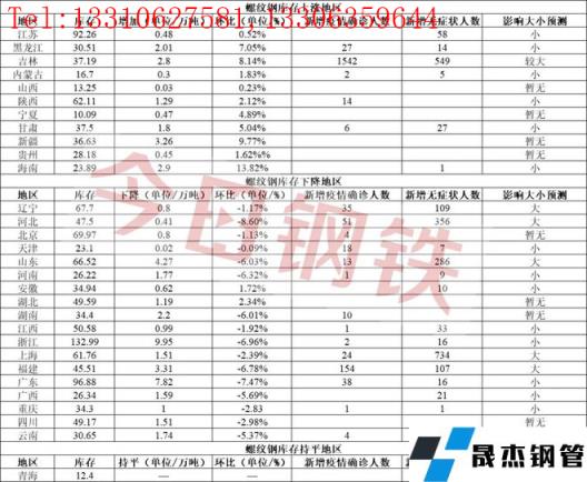 通過以上信息,小編了解到目前全國重點鋼鐵區(qū)域例如唐山大部分鋼企維持生產(chǎn),但因交通管制,無縫鋼管廠家目前出貨面臨運輸困難;針對全國還有一些重點省市無縫鋼管廠家也受到了影響情況如下: