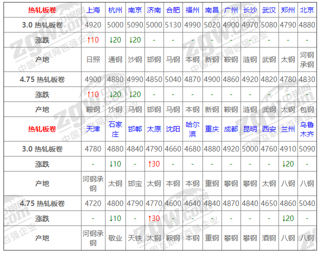 全國(guó)24個(gè)主要市場(chǎng)3.0 熱軋板卷平均價(jià)格4915元/噸,較上個(gè)交易日下調(diào)7元/噸。