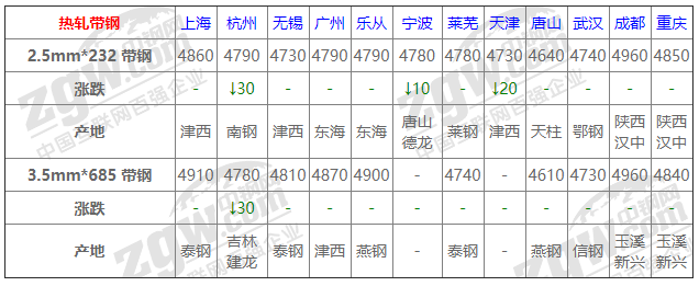 全國(guó)10個(gè)主要市場(chǎng)3.5mm*685 帶鋼平均價(jià)格4815元/噸,較上個(gè)交易日下調(diào)5元/噸。