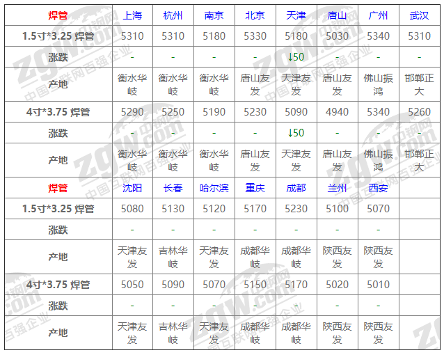 全國(guó)15個(gè)主要市場(chǎng)1.5寸*3.25 焊管平均價(jià)格5193元/噸,較上個(gè)交易日下調(diào)3元/噸。
