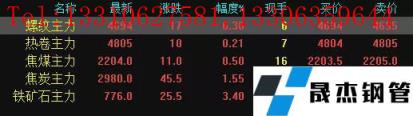 今日螺紋主力期貨漲17,收?qǐng)?bào)4694,漲幅0.36%;熱卷主力漲10,收?qǐng)?bào)4805,漲幅0.21%;焦煤主力漲11,收?qǐng)?bào)2204,漲幅0.5%;焦炭主力漲45.5,收?qǐng)?bào)2980,漲幅1.55%;鐵礦石主力漲25.5收?qǐng)?bào)776,漲幅3.4%。