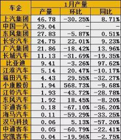 1月我國汽車產銷降幅明顯,多數車企呈現雙位數下跌