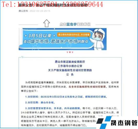 免責聲明:本網站(山東聊城晟杰無縫鋼管廠m.cuirutang.cn)刊載的“突發!唐山全域性封控,鋼市影響升級”等均源于網絡,版權歸原作者所有,且僅代表原作者觀點,本文所載信息僅供參考。轉載僅為學習與交流之目的,如無意中侵犯您的合法權益,請及時聯系刪除。本網站刊登此篇文章并不意味著本站贊同其觀點或證實其內容的真實性,我們不對其科學性、嚴肅性等作任何形式的保證。如果侵犯了您的版權,請盡快聯系我們予以撤銷,謝謝合作!