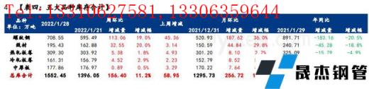本周五大品種總庫存依然處于累庫趨勢,其中廠庫周環(huán)比增2.7%,月環(huán)比增3.6%,年同比降30.7%;社庫周環(huán)比增14.9%,月環(huán)比增27.6%,年同比減3.4%;總庫存周環(huán)比增11.2%,月環(huán)比增19.8%,年同比減13%。綜合來看,目前庫存累增幅度依舊略低于預期,本周社庫雖然大幅累增近157萬噸,但整體庫存水平依舊低于去年同期水平,主要原因在于2021年大面積執(zhí)行能耗雙控,粗鋼及鋼材同比減量,使得入庫資源和市場流入資源大幅減量影響。綜合來看,春節(jié)需求停滯,庫存必然延續(xù)性累增,加之目前最強雨雪天氣襲來,碼頭、港口、陸路等卸貨均受阻,入庫節(jié)奏受限,因此節(jié)后增幅大概率比目前更加突出。