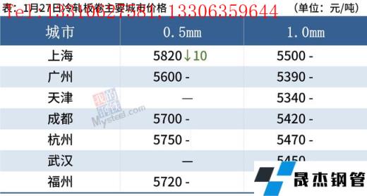 冷軋板卷:1月27日,全國(guó)24個(gè)主要城市1.0mm冷卷均價(jià)5468元/噸,較上個(gè)交易日持平。據(jù)不完全統(tǒng)計(jì),現(xiàn)冷軋無(wú)縫鋼管廠家庫(kù)存36.05萬(wàn)噸,周環(huán)比增加1.64萬(wàn)噸,社會(huì)庫(kù)存125.26萬(wàn)噸,周環(huán)比增加2.88萬(wàn)噸,周消費(fèi)量77.89萬(wàn)噸,環(huán)比減少1.95萬(wàn)噸。綜合來(lái)看,故預(yù)計(jì)28日國(guó)內(nèi)冷軋板卷價(jià)格或?qū)⒗^續(xù)平穩(wěn)運(yùn)行。