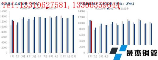 回顧一月鐵礦鐵礦基本面情況,遠(yuǎn)端供應(yīng)鐵礦石發(fā)運量在季末沖量后出現(xiàn)回落,巴西雨季的提前到來也進(jìn)一步加重了供應(yīng)端的減量;近端供應(yīng)則表現(xiàn)相對強勢,由于時間周期影響中國鐵礦石到港量在一月份迎來了短期的高點;國產(chǎn)礦方面,隨著新一年的生產(chǎn)指標(biāo)充裕以及礦山利潤高企,產(chǎn)量加速恢復(fù),預(yù)計1月整體國內(nèi)供應(yīng)環(huán)比增加416萬噸。需求端來看,1月各地限產(chǎn)放松,無縫厚壁鋼管廠家積極復(fù)產(chǎn),整體鐵水產(chǎn)量出現(xiàn)明顯增量,預(yù)計1月礦石需求環(huán)比增加約690萬噸,但是由于復(fù)產(chǎn)前補庫需求較大,疊加臨近春節(jié)無縫厚壁鋼管廠家需要往廠內(nèi)加大提貨量提高廠內(nèi)庫存,疏港環(huán)比上月增加1004萬噸。體現(xiàn)到庫存端,本月庫存總量(含礦山庫存、無縫厚壁鋼管廠家廠內(nèi)庫存和壓港)增加約276萬噸,較上月累庫幅度收窄124萬噸,其中無縫厚壁鋼管廠家廠內(nèi)庫存增加358萬噸而港口庫存下降325萬噸。
