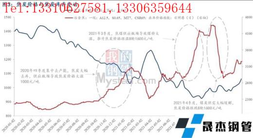 2)而2021年雖沒有再出現(xiàn)2020年4季度集中大幅去產(chǎn)能的情況。但仍出現(xiàn)了2021年三季度焦炭價格大漲1600元/噸的情形,兩個半月漲幅48%,漲幅明顯高于2020年四季度。這主要是由于焦煤供應(yīng)受限導(dǎo)致的煤價大漲推升焦炭成本大幅上漲,以呂梁低硫主焦煤來看,其價格從6月底至9月底漲了一倍(2050-4100元/噸),焦炭供應(yīng)矛盾從產(chǎn)能約束轉(zhuǎn)移至原料供應(yīng)受限。同樣的,2021年四季度后,國家出臺煤炭保供政策,原料供應(yīng)大幅緩解,同時需求端鐵水產(chǎn)量大減,最終傳導(dǎo)至焦煤價格大跌,焦炭價格應(yīng)聲回落1600元/噸。
