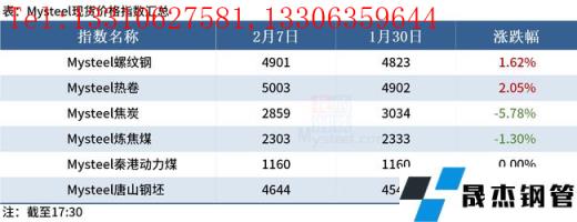 ◎ 2月7日,全國31個主要城市螺紋鋼均價4892元/噸,較節前(1月30日)上漲75元/噸;全國24個主要城市熱軋板卷均價5011元/噸,上漲97元/噸。