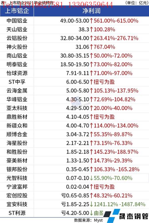 免責聲明:本網站(山東聊城晟杰無縫鋼管廠m.cuirutang.cn)刊載的“23家上市鋁企披露2021年業績預報,超8成凈利潤增長”等均源于網絡,版權歸原作者所有,且僅代表原作者觀點,本文所載信息僅供參考。轉載僅為學習與交流之目的,如無意中侵犯您的合法權益,請及時聯系刪除。本網站刊登此篇文章并不意味著本站贊同其觀點或證實其內容的真實性,我們不對其科學性、嚴肅性等作任何形式的保證。如果侵犯了您的版權,請盡快聯系我們予以撤銷,謝謝合作!
