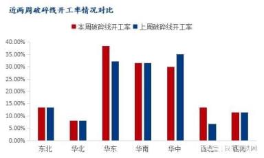 截止2月09日,統(tǒng)計(jì)全國(guó)242條廢鋼破碎線開工情況,廢鋼破碎線開工率為26.64%,較上周增2.87%,本周全國(guó)廢鋼破碎線開工率小增。全國(guó)區(qū)域?qū)Ρ瓤矗瑬|北、華北、華南、西南地區(qū)破碎線開工率較上周持平,華東地區(qū)破碎線開工率較上周增6.25%,華中地區(qū)破碎線開工率較上周降5%,西北地區(qū)破碎線開工率較上周增6.67%。