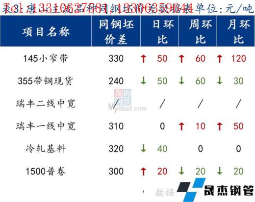 145帶鋼與鋼坯價(jià)差拉大,小窄帶漲幅高于鋼坯上漲速度,調(diào)坯軋材廠仍在停產(chǎn)。焊管與355帶鋼價(jià)差較昨日持平,熱卷與帶鋼價(jià)差擴(kuò)大,卷帶差修復(fù)。
