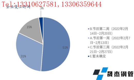 2、節(jié)后復(fù)工時(shí)間較去年同比明顯提前。調(diào)研時(shí)已全部復(fù)工的企業(yè)占比59%;已部分復(fù)工的企業(yè)占比26%。節(jié)后第一周(2022年2月7日-2月14日)能全部復(fù)工的占比31%;節(jié)后第二周節(jié)后第二周(2022年2月15日-2月22日)能全部復(fù)工的占比51%。