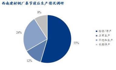 1、據調研顯示,西南地區33家建筑厚壁無縫鋼管生產企業中,春節期間有停產檢修計劃18家,占比54.55%,不飽和生產8家,占比24.24%,合計影響產量約235.75萬噸;另4家無縫厚壁鋼管廠家正常生產,3家無縫厚壁鋼管廠家長期停產。