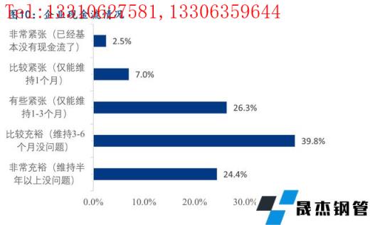 據(jù)調(diào)研,64.1%的樣本企業(yè)資金流是比較或者非常充裕的,26.3%的樣本企業(yè)資金有些緊張,僅能維持1-3個月,而資金壓力比較及非常緊張的樣本企業(yè)占比9.6%。