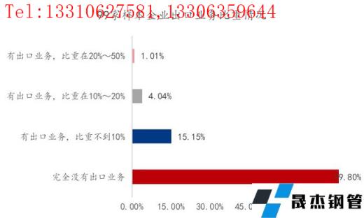 從圖23上看,完全沒(méi)有出口業(yè)務(wù)的企業(yè)占比為79.80%;有出口業(yè)務(wù)比重不到10%的企業(yè)占比為15.15%;有出口業(yè)務(wù)比重在10%-20%的企業(yè)占比為4.04%;有出口業(yè)務(wù)比重在20%-50%的企業(yè)占比為1.01%。