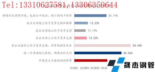 8、對(duì)于2022年發(fā)展前景預(yù)期偏謹(jǐn)慎。本次調(diào)研樣本企業(yè)中對(duì)2022年發(fā)展前景預(yù)期持樂(lè)觀或比較以及非常樂(lè)觀的企業(yè)占比57.58%,不太樂(lè)觀或比較悲觀的企業(yè)占比為33.33%,因此對(duì)于未來(lái)一段時(shí)間的投入情況,持適當(dāng)或大規(guī)模增加的企業(yè)占比為46.46%,暫不增加投入的占比為43.43%,適當(dāng)縮減或退出部分業(yè)務(wù)的企業(yè)占比為10.10%,由此看來(lái),目前整體經(jīng)濟(jì)環(huán)境的確面臨一定壓力,導(dǎo)致企業(yè)信心相對(duì)保守,而主要原因是經(jīng)濟(jì)下行壓力下,穩(wěn)增長(zhǎng)政策力度不夠。企業(yè)希望得到政府的支持與改進(jìn)的呼聲最大的是開展更大力度的減稅降費(fèi)以及降低融資成本,進(jìn)一步清理拖欠賬款,確保及時(shí)支付,持續(xù)優(yōu)化營(yíng)商環(huán)境,公平執(zhí)法、減少微觀干預(yù)。