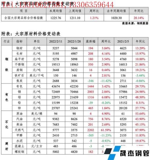 免責聲明:本網站(山東聊城晟杰無縫鋼管廠m.cuirutang.cn)刊載的“MRI:大宗原材料價格周報(2月7日-2月11日)”等均源于網絡,版權歸原作者所有,且僅代表原作者觀點,本文所載信息僅供參考。轉載僅為學習與交流之目的,如無意中侵犯您的合法權益,請及時聯系刪除。本網站刊登此篇文章并不意味著本站贊同其觀點或證實其內容的真實性,我們不對其科學性、嚴肅性等作任何形式的保證。如果侵犯了您的版權,請盡快聯系我們予以撤銷,謝謝合作!