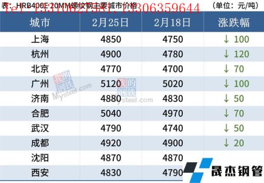 截至2月25日,全國(guó)主要城市20mm三級(jí)抗震螺紋鋼均價(jià)4869元/噸,周環(huán)比下跌53元/噸;8.0mmHPB300高線均價(jià)5067元/噸,周環(huán)比下跌58元/噸。