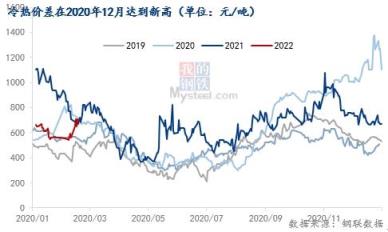 去年同期(2021年2月),由于汽車以及直接出口需求旺盛,冷軋強熱軋弱的局面明顯,冷軋總庫存累庫高度同比降幅達20%,冷熱價差也拉到新高,月均值達800元/噸以上。在去年同期冷軋“如火如荼”的行情襯托下,顯得今年的冷軋春天愈發“寒冷”。