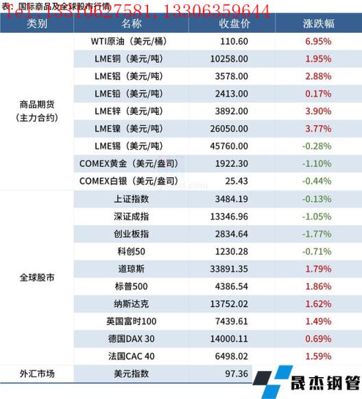 ◎ 安賽樂(lè)米塔爾歐洲公司宣布從2022年3月1日起將當(dāng)?shù)劁N售的熱軋板卷價(jià)格大幅提高180歐元/噸(200美元/噸)。歐洲無(wú)縫厚壁鋼管廠家可能將冷軋板卷的目標(biāo)價(jià)格定在1250歐元/噸(1389美元/噸),熱鍍鋅板定在1300歐元/噸(1445美元/噸)。