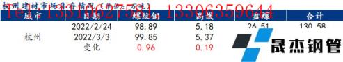 分品種來看,以杭州市場為例,本周杭州市場建筑厚壁無縫鋼管總庫存為130.25萬噸,其中螺紋鋼庫存99.85萬噸,周環比增加0.96萬噸,增幅為0.97%;盤螺25.03萬噸,周環比減少1.48萬噸,降幅為5.58%;線材5.37萬噸,周環比增加0.19萬噸,增幅為3.67%。