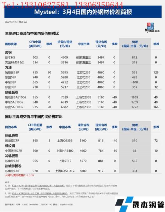 免責(zé)聲明:本網(wǎng)站(山東聊城晟杰無縫鋼管廠m.cuirutang.cn)刊載的“2022年03月04日日?qǐng)?bào):國內(nèi)外鋼材_無縫鋼管價(jià)差匯總(2022.3.4)”等均源于網(wǎng)絡(luò),版權(quán)歸原作者所有,且僅代表原作者觀點(diǎn),本文所載信息僅供參考。轉(zhuǎn)載僅為學(xué)習(xí)與交流之目的,如無意中侵犯您的合法權(quán)益,請(qǐng)及時(shí)聯(lián)系刪除。本網(wǎng)站刊登此篇文章并不意味著本站贊同其觀點(diǎn)或證實(shí)其內(nèi)容的真實(shí)性,我們不對(duì)其科學(xué)性、嚴(yán)肅性等作任何形式的保證。如果侵犯了您的版權(quán),請(qǐng)盡快聯(lián)系我們予以撤銷,謝謝合作!