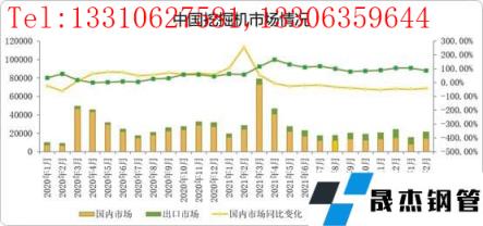 據市場情況了解到,2月份國內市場預估銷量15000臺,國內市場銷量增速降幅小幅收窄;出口市場預估銷量7000臺,增速87%左右。按照三月份的調研數據顯示,預計國內工程機械市場仍然按照年度周期性進入旺季。一季度的年度旺季的起始點在2月15日左右市場才有所啟動,2月整體的挖掘機市場情況環比情況好轉,節后需求逐步恢復,基建下行壓力緩解。當前受國際形勢影響,挖機機的市場國內外分配情況情況存在變動,整體趨勢走向還是向上為主。