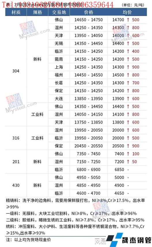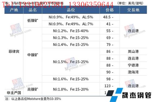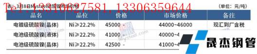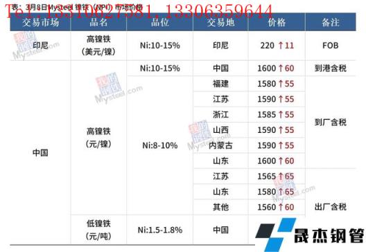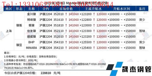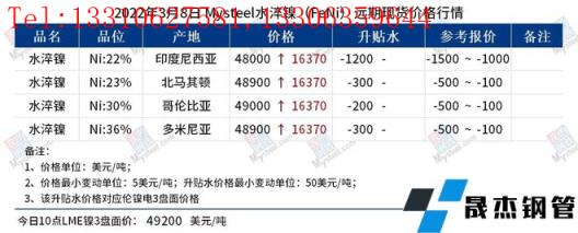 免責聲明:本網站(山東聊城晟杰無縫鋼管廠m.cuirutang.cn)刊載的“鎳產業鏈價格(2022.3.8)”等均源于網絡,版權歸原作者所有,且僅代表原作者觀點,本文所載信息僅供參考。轉載僅為學習與交流之目的,如無意中侵犯您的合法權益,請及時聯系刪除。本網站刊登此篇文章并不意味著本站贊同其觀點或證實其內容的真實性,我們不對其科學性、嚴肅性等作任何形式的保證。如果侵犯了您的版權,請盡快聯系我們予以撤銷,謝謝合作!