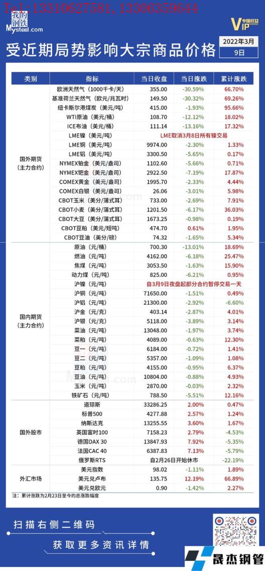 近期,受國際局勢影響,全球金融及大宗商品市場出現較大波動。3月9日,伴隨俄烏局勢出現緩和跡象,能源和有色金屬上演了行情“大反轉”,歐美股市則大幅上漲。匯總情況如下: