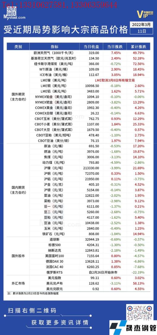 近期,受國際局勢影響,全球金融及大宗商品市場出現(xiàn)較大波動。3月11日,商品及金融市場漲跌互現(xiàn),波動幅度較前期明顯收窄。匯總情況如下: