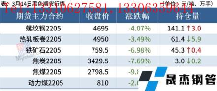熱軋板卷:3月14日,全國24個主要城市4.75mm熱軋板卷均價5118元/噸,較上個交易日下跌53元/噸。黑色商品期貨市場大幅下挫,下游采購量觀望,商家心態悲觀,全天成交清淡。綜合來看,當前疫情呈現復發,剛需釋放有限,商家預期迷茫。短期鋼價震蕩運行,既因為情緒受到期貨市場的引導,又因為需求沒有放量的跡象,而無縫厚壁鋼管廠家起到"托舉"的作用。綜合來看,預計15日熱軋板卷價格或震蕩下行為主。