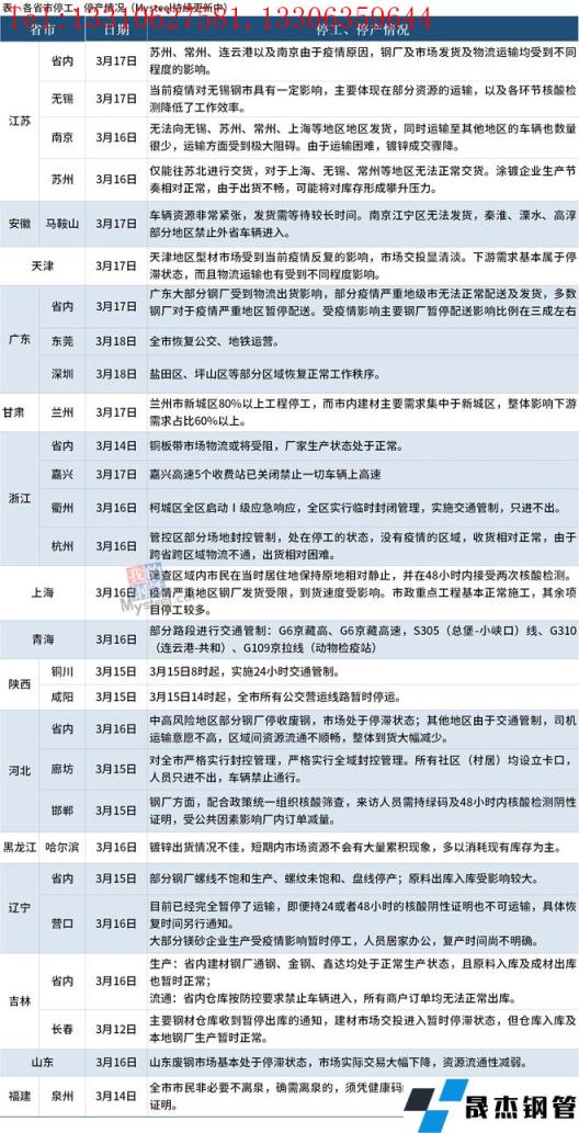 截至3月18日,匯總了15個(gè)省份停工停產(chǎn)最新信息。其中,江蘇省內(nèi)蘇州、常州、連云港以及南京由于疫情原因,無(wú)縫厚壁鋼管廠家及市場(chǎng)發(fā)貨及物流運(yùn)輸均受到不同程度的影響。安徽省內(nèi)出現(xiàn)車輛資源非常緊張,發(fā)貨需等待較長(zhǎng)時(shí)間等情況,無(wú)法向南京江寧區(qū)發(fā)貨,秦淮、溧水、高淳部分地區(qū)禁止外省車輛進(jìn)入。廣東省大部分無(wú)縫厚壁鋼管廠家受到物流出貨影響,部分疫情嚴(yán)重地級(jí)市無(wú)法正常配送及發(fā)貨,多數(shù)無(wú)縫厚壁鋼管廠家對(duì)于疫情嚴(yán)重地區(qū)暫停配送。受疫情影響主要無(wú)縫厚壁鋼管廠家暫停配送影響比例在三成左右;東莞全市恢復(fù)公交、地鐵運(yùn)營(yíng);深圳鹽田區(qū)、坪山區(qū)等部分區(qū)域恢復(fù)正常工作秩序。具體情況如下: