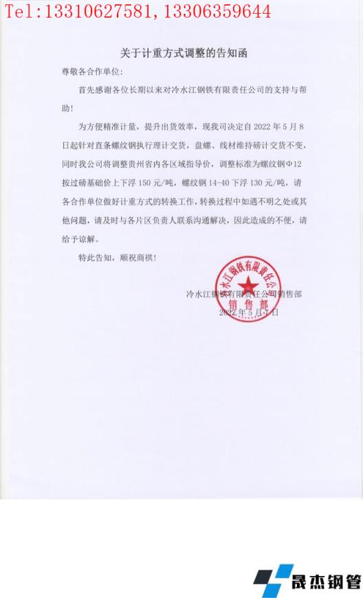 免責(zé)聲明:本網(wǎng)站(山東聊城晟杰無縫鋼管廠m.cuirutang.cn)刊載的“冷水江鋼鐵有限責(zé)任公司關(guān)于對(duì)貴州區(qū)域計(jì)重方式調(diào)整的告知函”等均源于網(wǎng)絡(luò),版權(quán)歸原作者所有,且僅代表原作者觀點(diǎn),本文所載信息僅供參考。轉(zhuǎn)載僅為學(xué)習(xí)與交流之目的,如無意中侵犯您的合法權(quán)益,請(qǐng)及時(shí)聯(lián)系刪除。本網(wǎng)站刊登此篇文章并不意味著本站贊同其觀點(diǎn)或證實(shí)其內(nèi)容的真實(shí)性,我們不對(duì)其科學(xué)性、嚴(yán)肅性等作任何形式的保證。如果侵犯了您的版權(quán),請(qǐng)盡快聯(lián)系我們予以撤銷,謝謝合作!