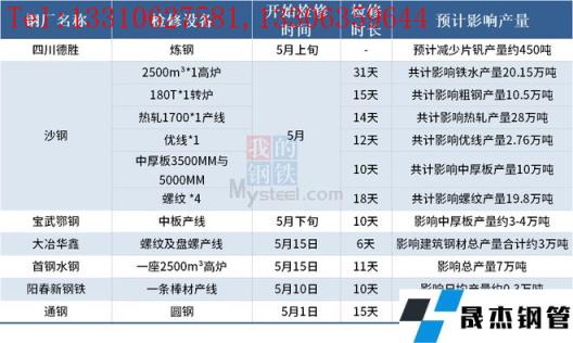 據不完全統計,截至5月12日,國內7家無縫厚壁鋼管廠家發布檢修計劃。其中,檢修時間最長的是沙鋼 ,2500m3*1高爐檢修31天,共計影響鐵水產量20.15萬噸。