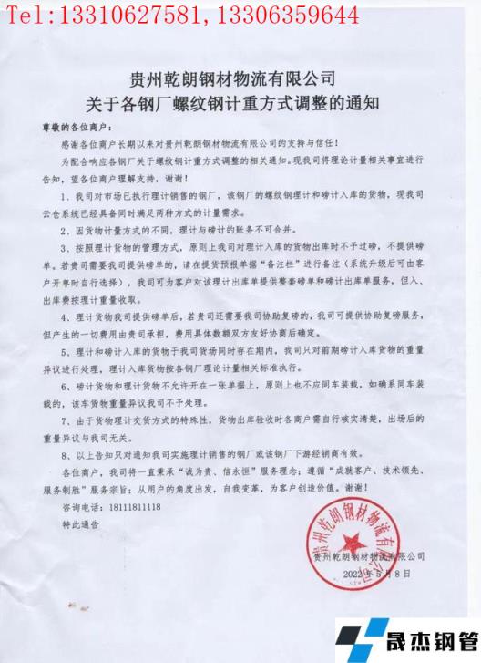 免責聲明:本網站(山東聊城晟杰無縫鋼管廠m.cuirutang.cn)刊載的“貴州乾朗鋼材_無縫鋼管物流有限公司關于各無縫鋼管廠家螺紋鋼計重方式調整的通知”等均源于網絡,版權歸原作者所有,且僅代表原作者觀點,本文所載信息僅供參考。轉載僅為學習與交流之目的,如無意中侵犯您的合法權益,請及時聯系刪除。本網站刊登此篇文章并不意味著本站贊同其觀點或證實其內容的真實性,我們不對其科學性、嚴肅性等作任何形式的保證。如果侵犯了您的版權,請盡快聯系我們予以撤銷,謝謝合作!
