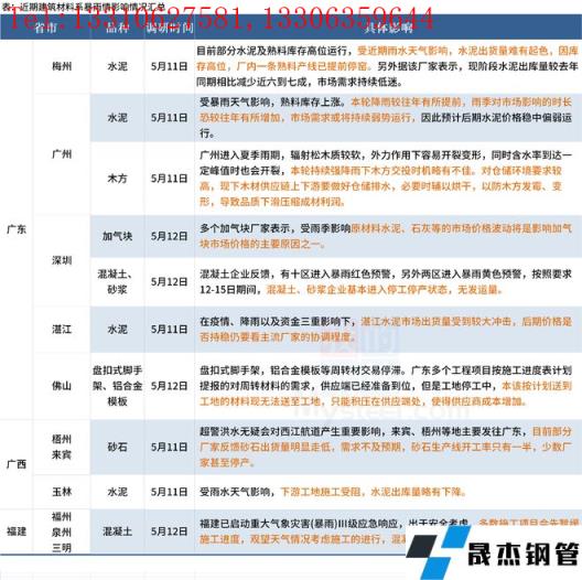 截至5月12日,據百年建筑網調研,3省建材市場和建筑工地進度受到明顯影響。本次降雨是今年以來廣東遭遇強度最強、范圍最廣、持續時間最長的強降水過程,城鄉積澇和地質災害風險極高,嚴重影響水泥企業出庫。目前降雨情況來看,多數施工項目會先暫緩施工進度,觀望天氣情況再考慮施工的進行。具體情況如下: