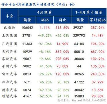 據統計,截至5月11日,4月銷量與上年同期相比,比亞迪銷量增速依然最為明顯。具體來看,比亞迪銷量106042輛穩居第一,環比增長1.11%,同比增長313.6%;其次是上汽集團銷量37781輛,環比下降49.29%,同比下降25.03%,值得一提的是吉利汽車銷量增幅最大,高達552%。受疫情影響,4月份絕大部分新能源車企銷量全線大跌,上汽、廣汽、小鵬等自主品牌車企無一例外集體銷量下滑,跌幅超過兩位,而比亞迪卻一直占據領先地位,銷量不僅沒跌,還一直保持穩增長。