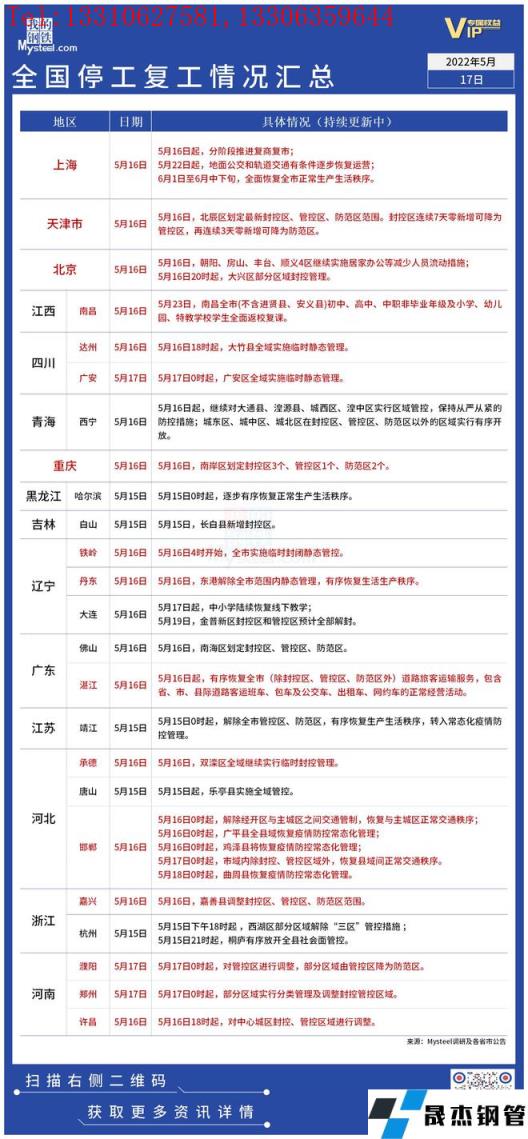 截至5月17日,據不完全統計,共有15個省份發布了停工復工最新信息。5月16日起,上海分階段推進復商復市。天津多地劃分為封控管控區。湛江有序恢復道路旅客運輸服務。四川廣安市廣安區、達州市大竹縣全域實施臨時靜態管理。具體情況如下: