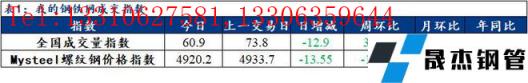 訊:全國建筑厚壁無縫鋼管成交量監測,成交量相對指數來看,全國60.9減12.9,北方51.1減0.5,華東75.7減22.9,南方51.5減9.8。今日螺紋鋼價格指數4920.2,較上一交易日減13.55。