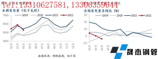 2022年4月份,全國生產原煤同比增長10.7%。4月我國進口煤同比增長8.4。4月我國用電同比增速回落1.3%,主要是受第二、三產業用電量同比下滑拖累,發電量同比下降4.3%。